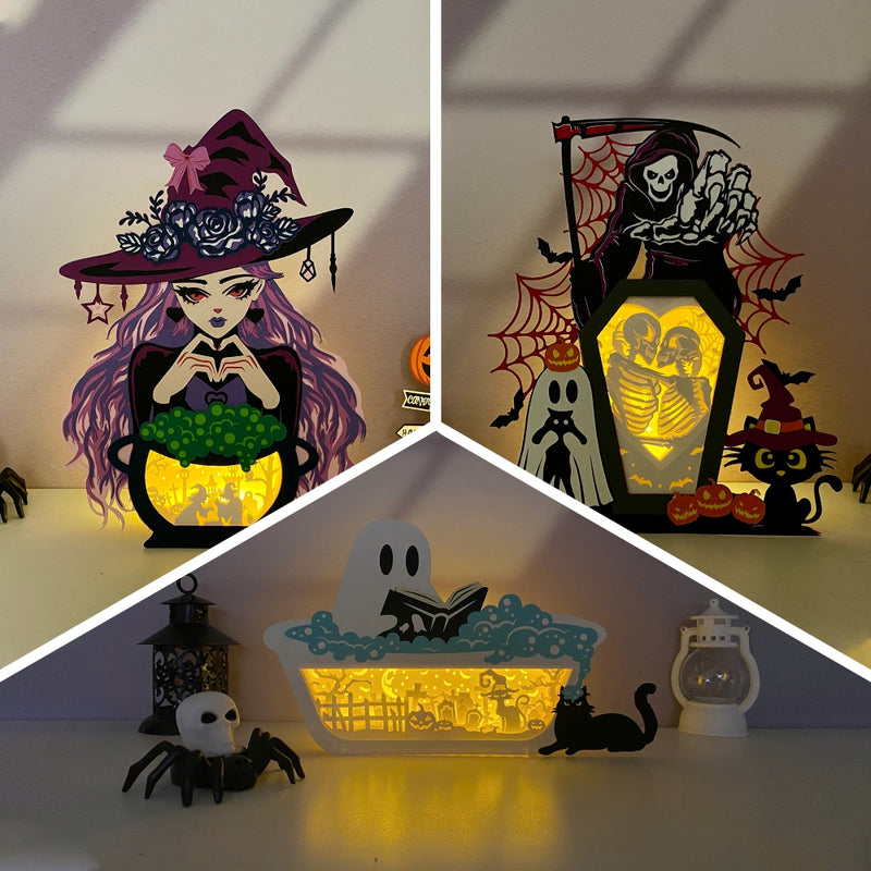 Pack 3 Halloween Lightbox 2 - 3D Witch Gnome Papercut Light Box File - Cricut File - LightBoxGoodMan
