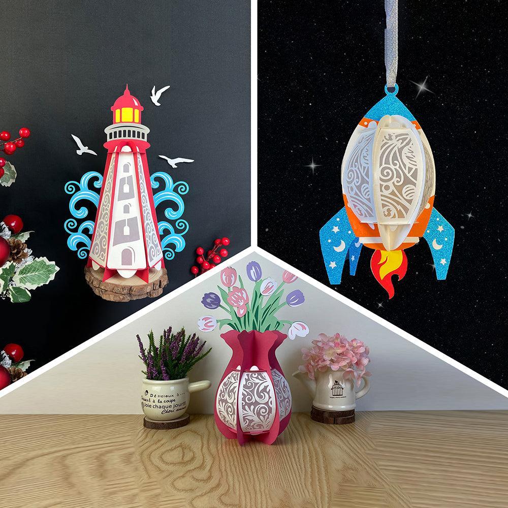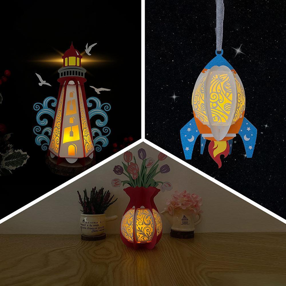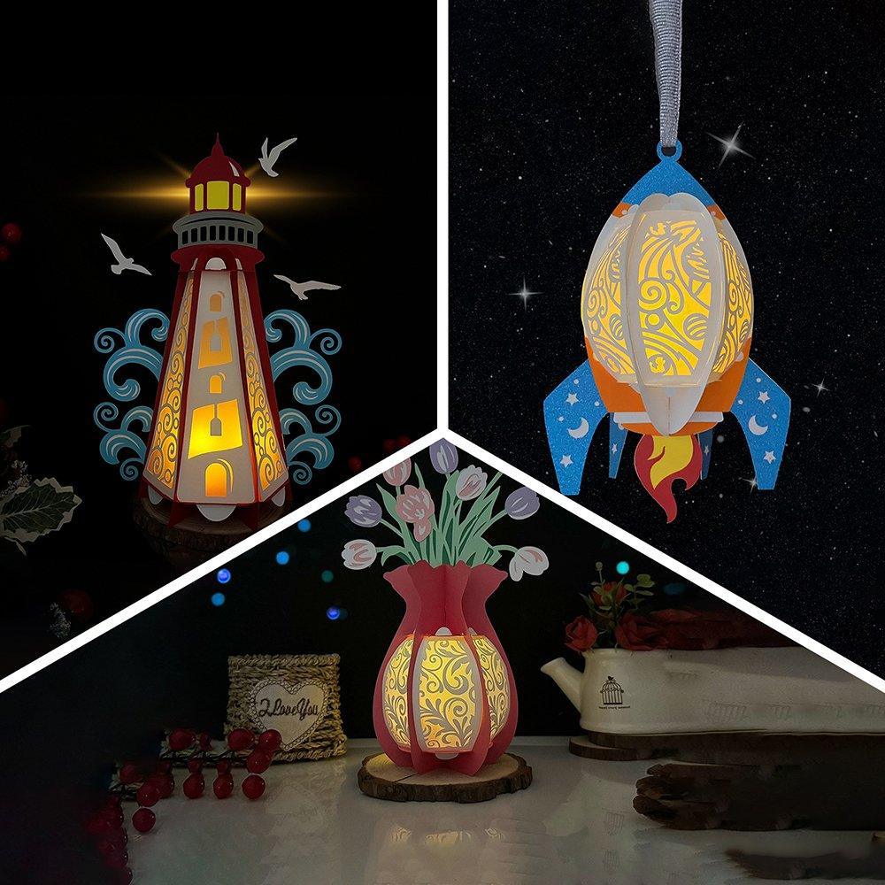 Pack 3 Different Themed Lanterns is one of more templates in the 3D Papercut Lantern collection which can be cut by hand or cutting machines (Cricut, Silhouette...). This design is perfect for your home decoration or you can make as a beautiful gift for your beloved. Dimension:* Rocket Lantern:- Height: 7.87" ~...